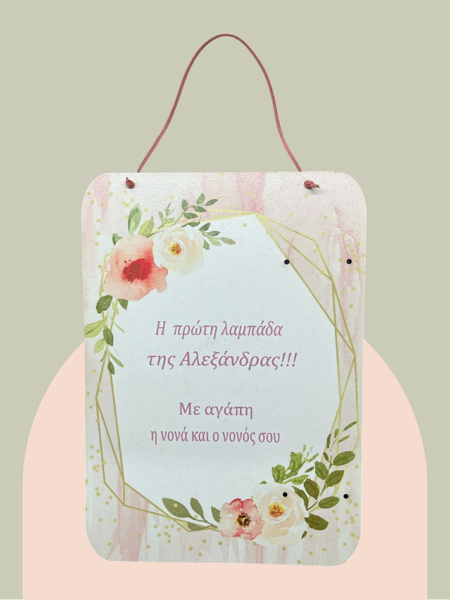 Η λαμπάδα είναι τοποθετημένη σε διακοσμητική βάση με floral σχέδιο και απαλά ροζ στοιχεία, ενώ είναι διακοσμημένη με χρυσό πλεξιγκλάς καθρέφτη κουνελάκι και μπεζ πομ πον για μυτούλα. Το όνομα του παιδιού και η αφιέρωση από τους νονούς χαρίζουν μοναδικό και προσωποποιημένο χαρακτήρα.