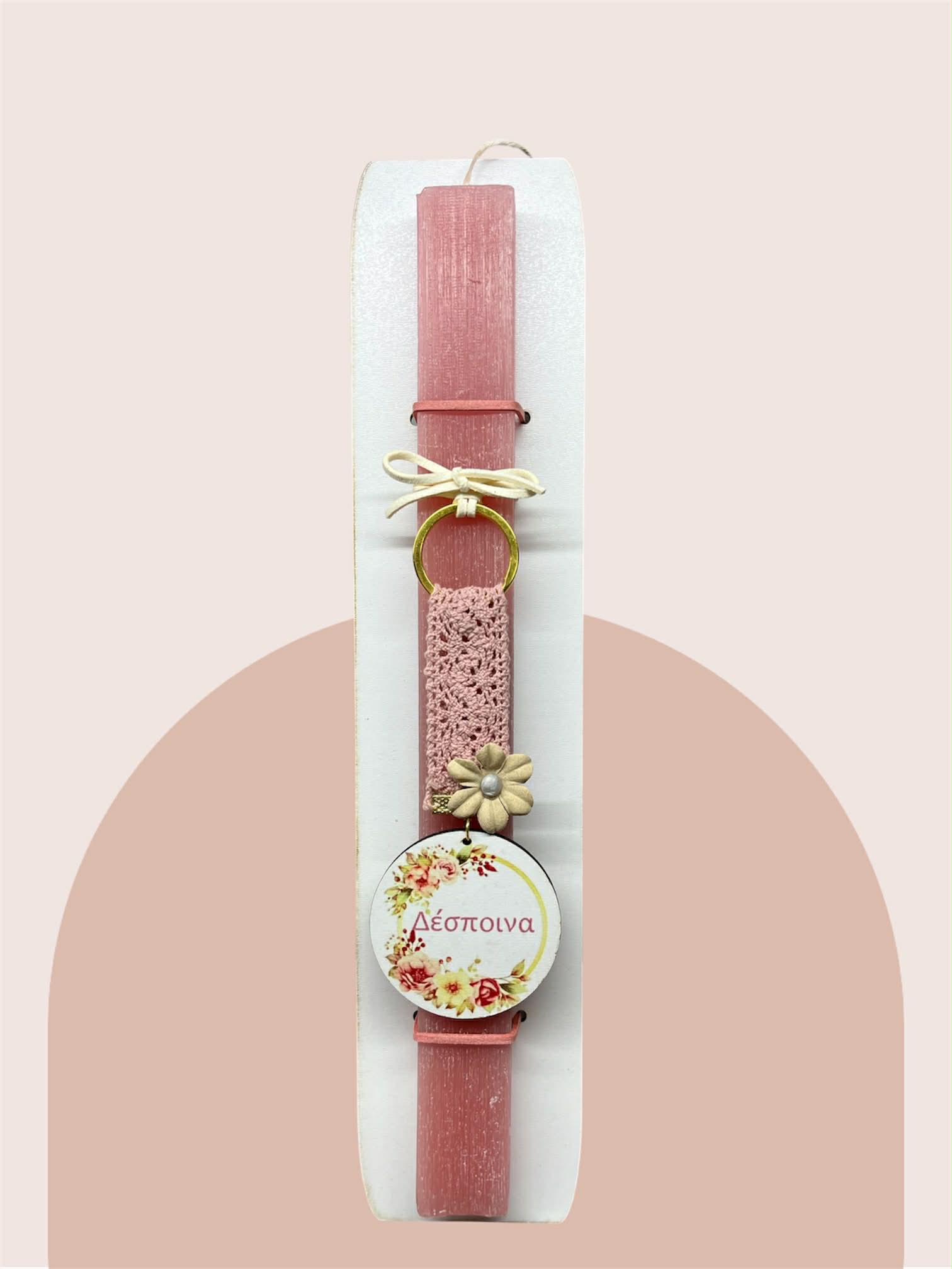Το κέντρο της κοσμεί ένα μπρελόκ σε φλοράλ διάθεση, πάνω στο οποίο προσαρμόσαμε μία αφιέρωση.