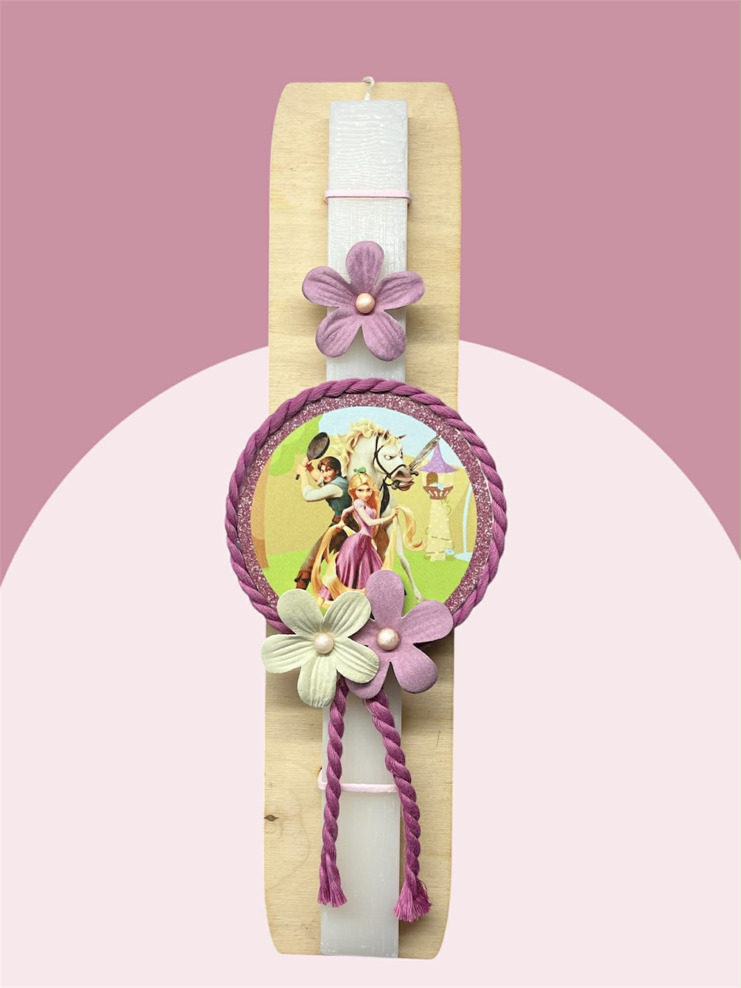 Χειροποίητη πασχαλινή λαμπάδα διακοσμημένη με εντυπωσιακό ξύλινο έγχρωμο στοιχείο με την Rapunzel.