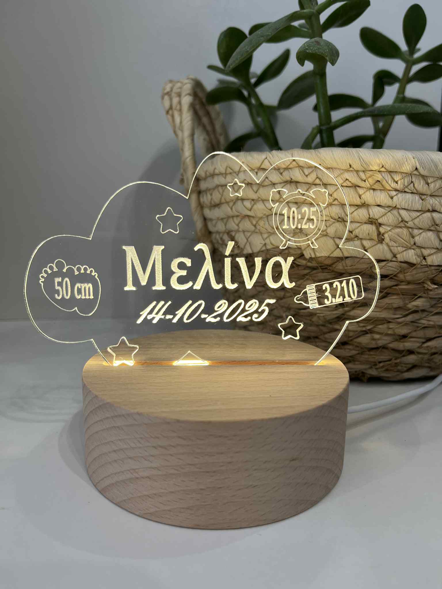 Δεξιά κι αριστερά υπάρχουν δύο συννεφάκια, ένα για κάθε παιδί με στοιχεία γέννησης και τα ονόματά τους πάλι στο χρώμα της μέντας συνδυασμένα με φυσική απόχρωση ξύλου.